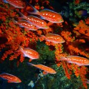 魚はタカベとスズメダイ、キンギョハナダイ。メジナの群れに混じってカンパチの群れ。